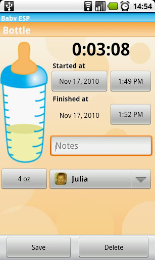 我用Baby ESP Trial來紀錄新生兒艾璇的喝奶時間和份量、大小便時間、睡眠時間、身高、體重等。老實說,一開始使用新手機加上新的App,心裡喜孜孜,艾璇發生甚麼我就立馬記錄一番(以下照片來自Google Play中Baby ESP Trial的應用程式螢幕截取畫面)。