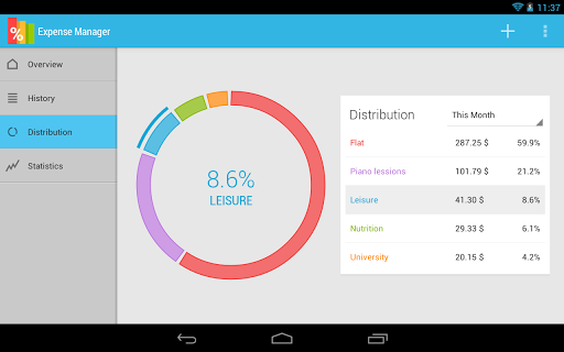 4. 清楚簡潔又好看的統計圖表:這功能Expense Manager需要付費版才會開放,但是相信我,值得花2.5歐元(約NT$100)買了!因為它的統計圖表非常清楚簡潔又好看,而統計圖表可以快速讓你回顧和瞭解過去的支出情況,進而對自己的支出做個省思和調整。換句話說,統計圖表才是回饋你怎麼去管理金錢的最快速和最佳方法。