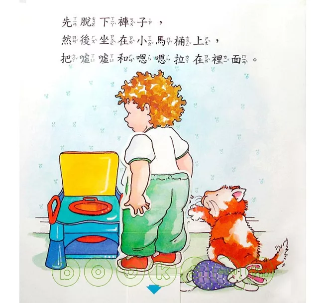 目前這本書歷經幾位小屁孩摧殘之下已經面目全非:書中小男孩褲子被脫掉、馬桶蓋被拆除、衛生紙拉不見等等...屬於退役書籍,但功不可沒。